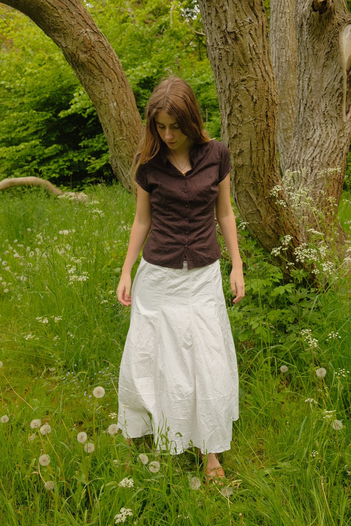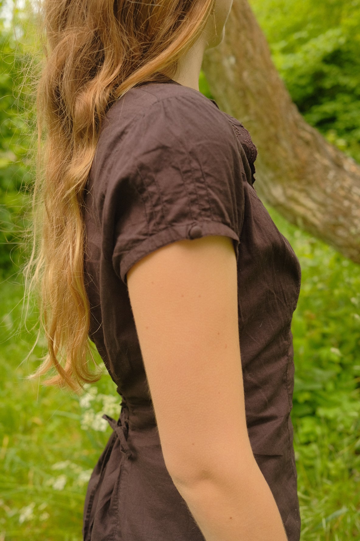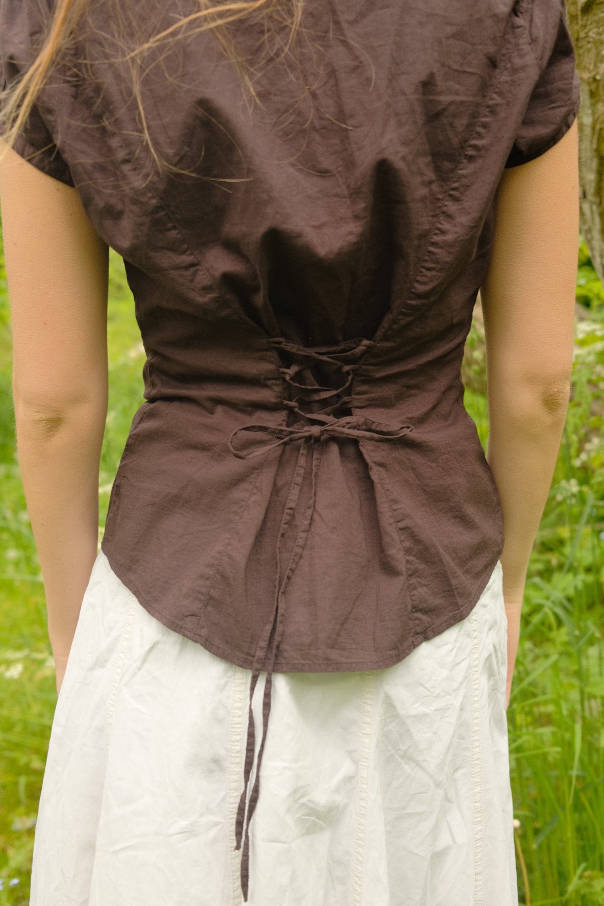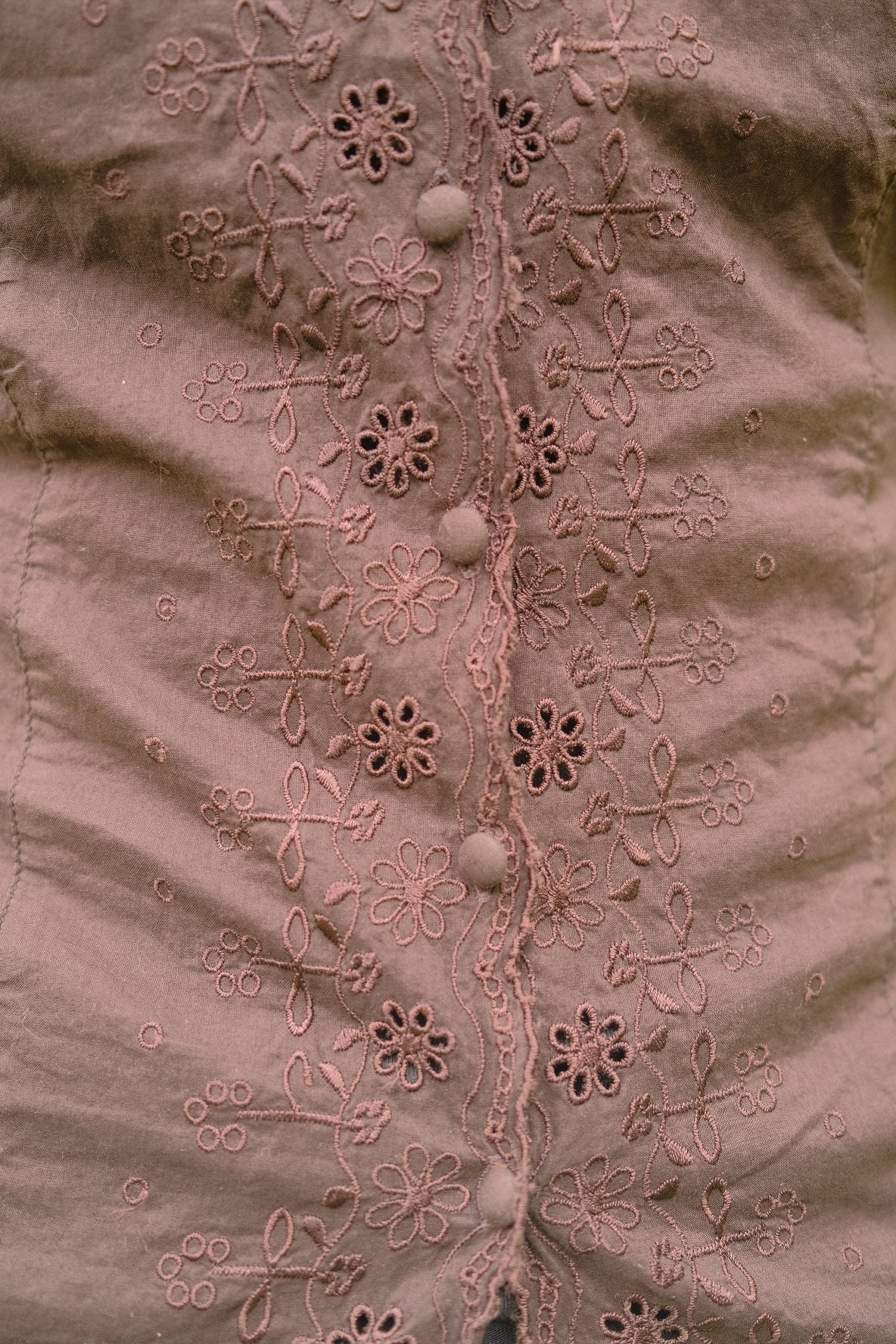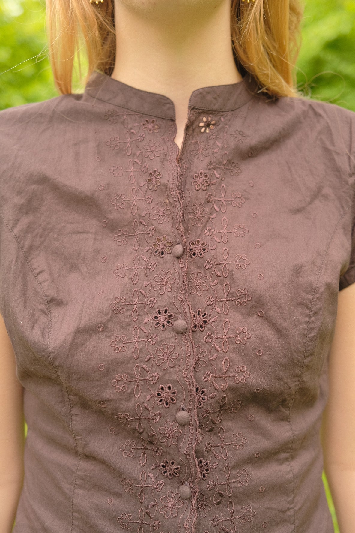 Brun luftig bomuldsskjorte med stofknapper og broderidetaljer. Skjorten har bånd på ryggen, så skjorten kan tilpasses omkring taljen.