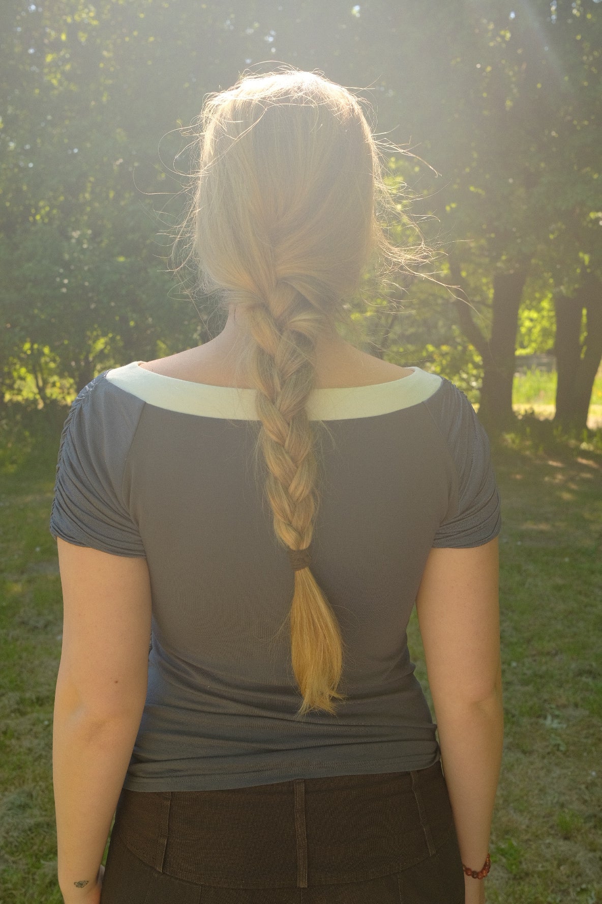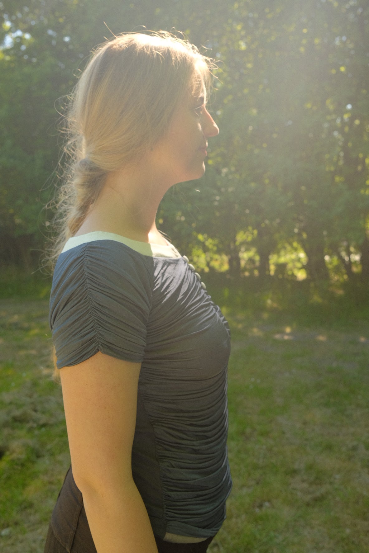 Grå-blå, tætsiddende top med rynkedetaljer og hvid halsudskæring.