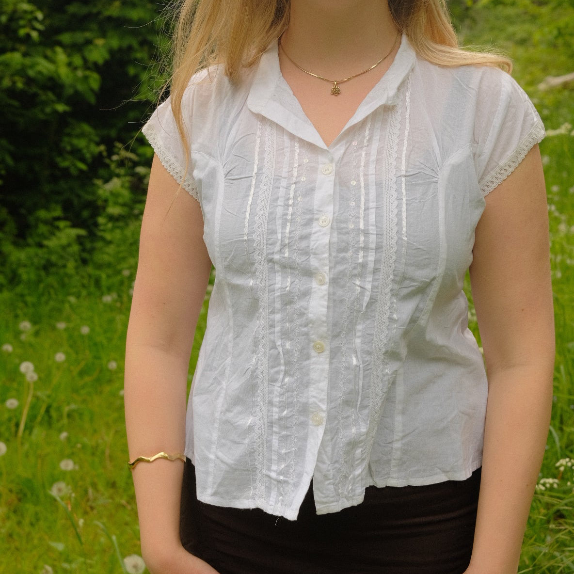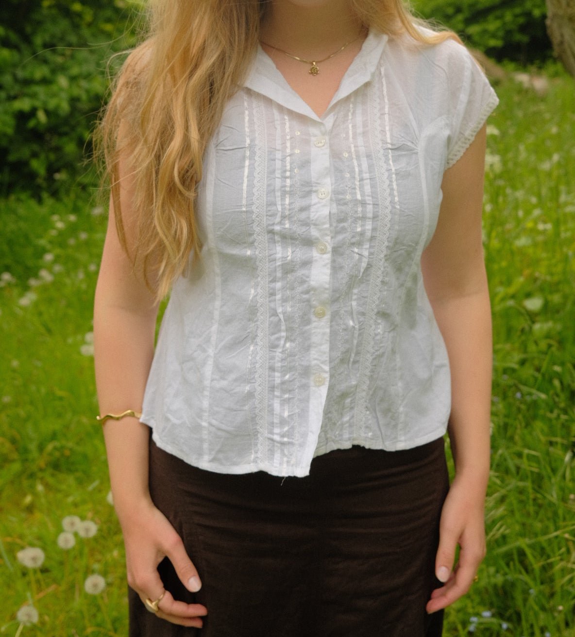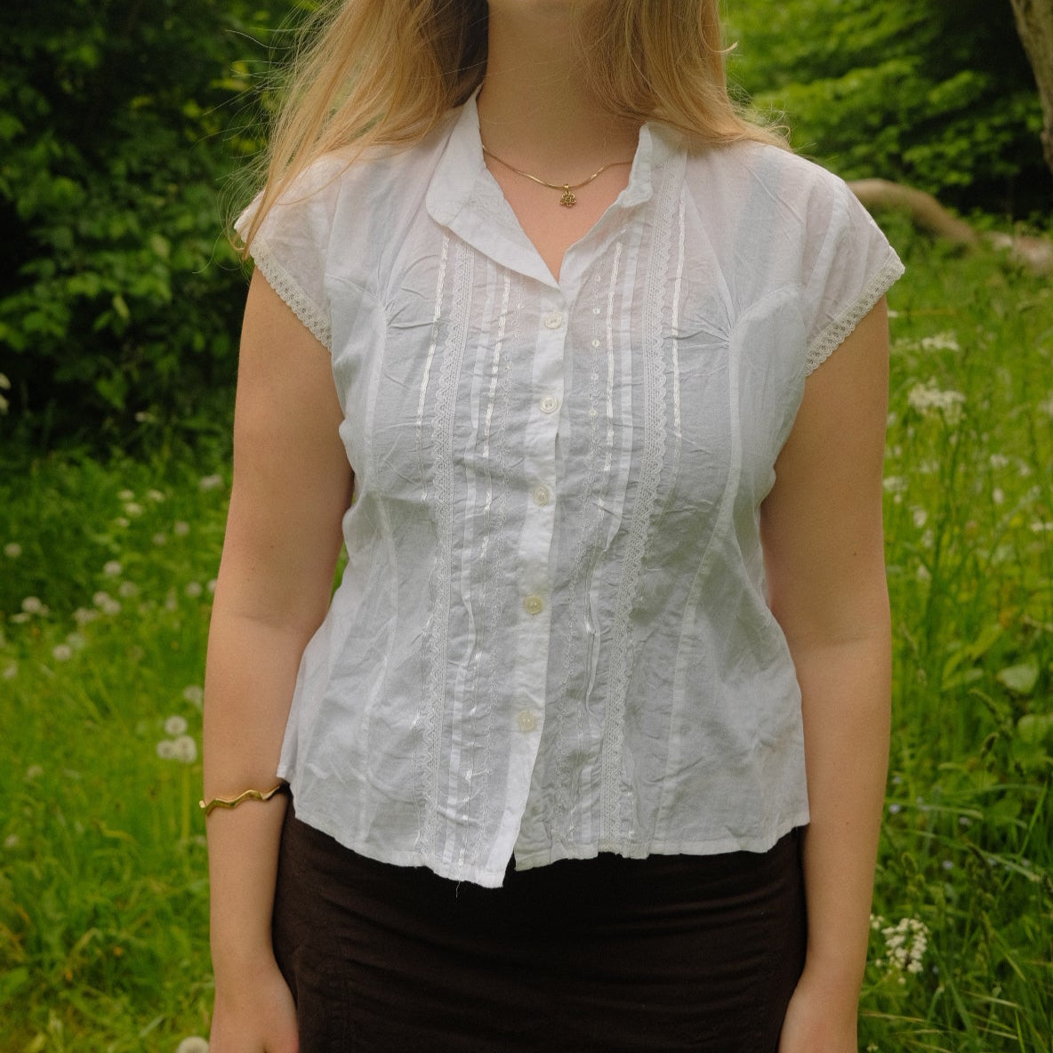 Hvid, luftig kortærmet skjorte med baner af blonder og broderi.