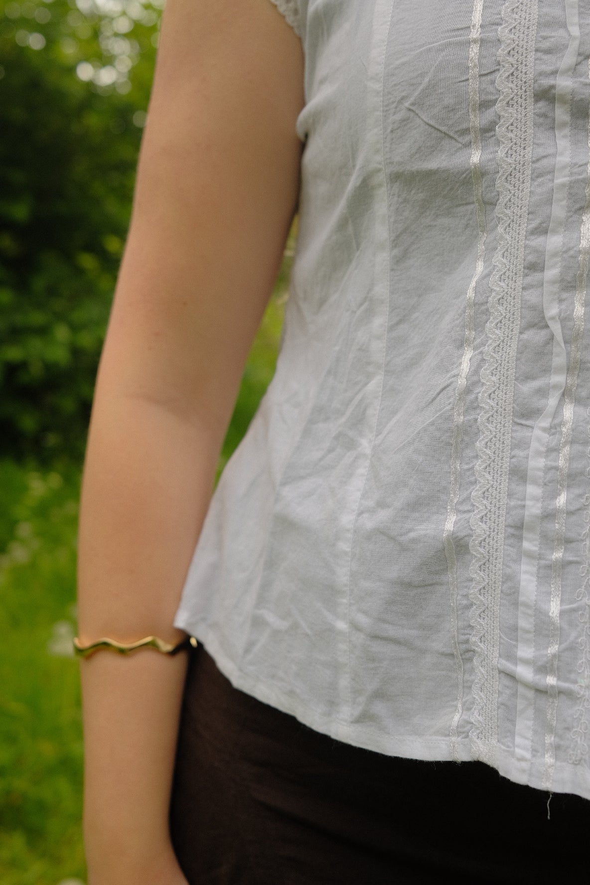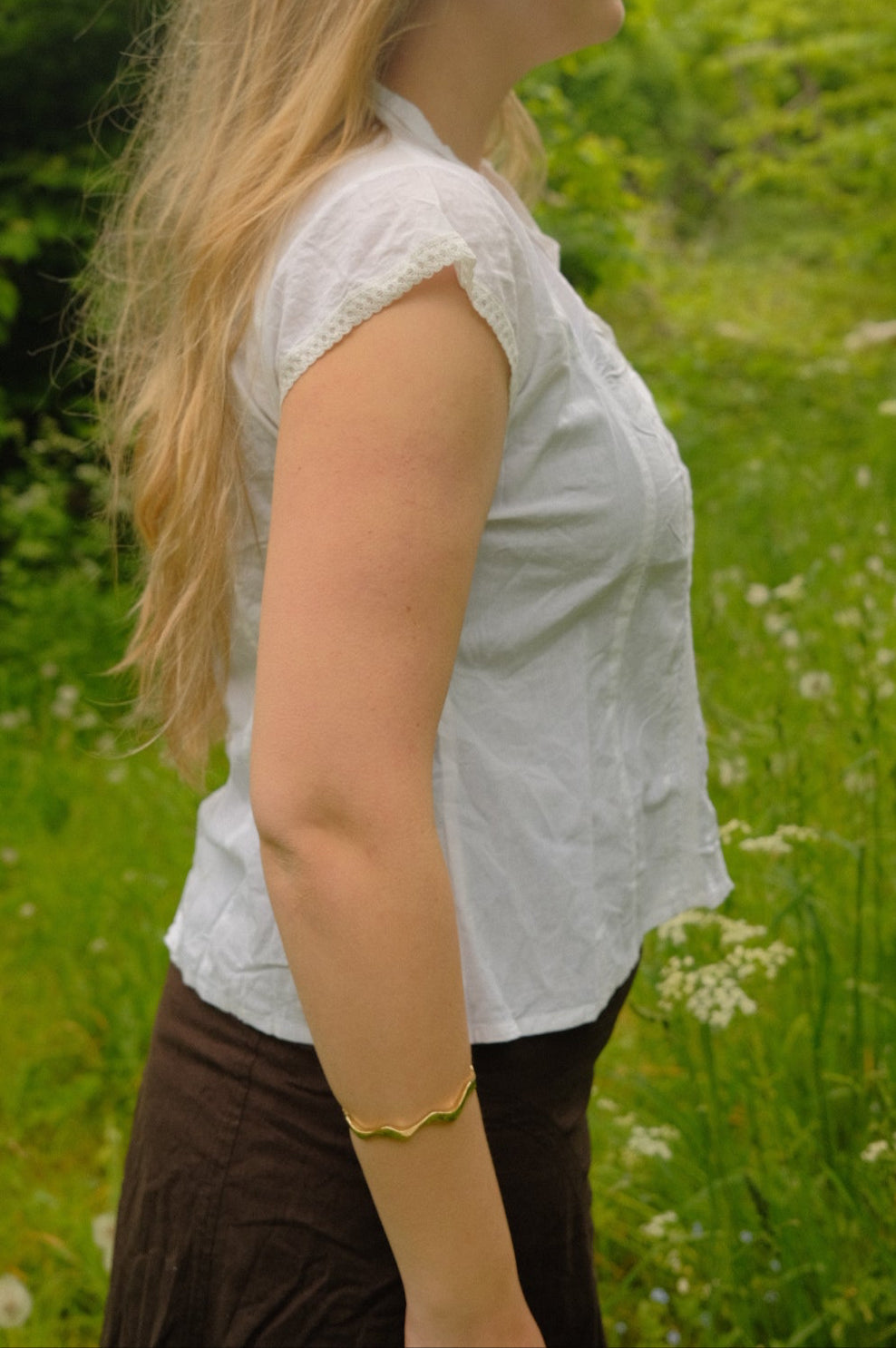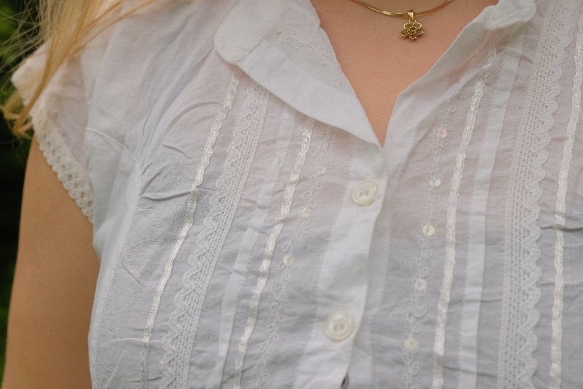 Hvid, luftig kortærmet skjorte med baner af blonder og broderi.